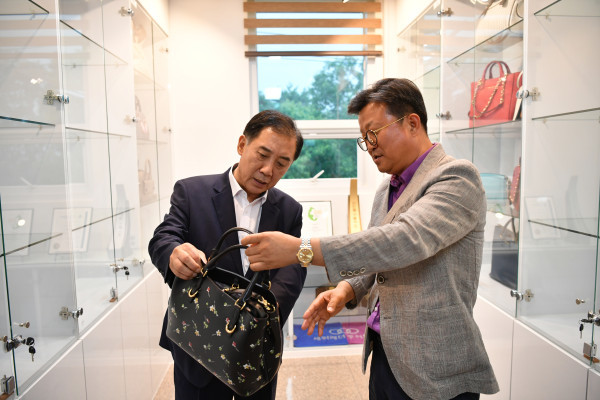 박윤국 경기 포천시장이 25일 자작동 왕방산공단 소재 가죽제품 제조업체 세화레더(주)를 방문했다. 이날 박 시장은 기업 애로사항을 청취하고 제품 생산라인을 견학하며 근무환경을 살폈다. 사진은 박 시장(왼쪽)이 관계자와 제품을 살펴보는 모습. (사진제공=포천시청)