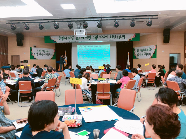 전남 순천시는 25일 시청 대회의실에서 주민자치위원회 위원 등 100명이 참석한 가운데 마을공동체 5개년 기본계획 공동체 비전을 논의하기 위해 ‘마을공동체 비전 수립 토론회’를 개최했다. 사진은 토론회가 진행되고 모습. (사진제공=순천시청)