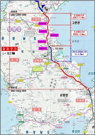 고현-이동 국도건설공사는 국도19호선 중에서 남해군 이동면 석평리~고현면 도마리 구간(10.2km)을 2차로에서 4차로로 신설․확장하는 공사로서 2019. 12월 개통 예정이었으나, 지역주민과 도로이용자의 편의를 위해 남해교차로~도마교차로 구간(4.3km)을 7월 30일(화) 우선 조기 개통할 계획이며,
