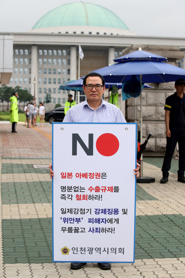 [인천=문찬식 기자] 인천시의회가 일본정부의 명분 없는 수출규제에 대한 즉각 철회 촉구를 위해 최근 이용범 의장을 시작으로 국회 정문 앞에서 릴레이 1인 시위를 진행 중이라고 밝혔다.