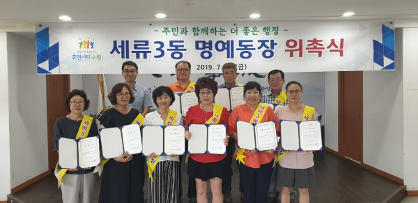 경기 수원시 권선구 세류3동 행정복지센터는 지난 26일 명예동장 위촉식을 개최했다. 명예동장은 29일부터 오는 8월2일까지 세류3동 단체장 10명이 오전·오후로 나뉘어 일일 동장체험을 하게 된다. 사진은 명예동장들이 기념촬영을 하는 모습. (사진제공=수원시청)