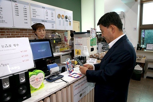 | ▲ 허성곤 김해시장이 지난 10일 시청사 내 한 카페에서 제로페이로 결재하고 있다. | ||