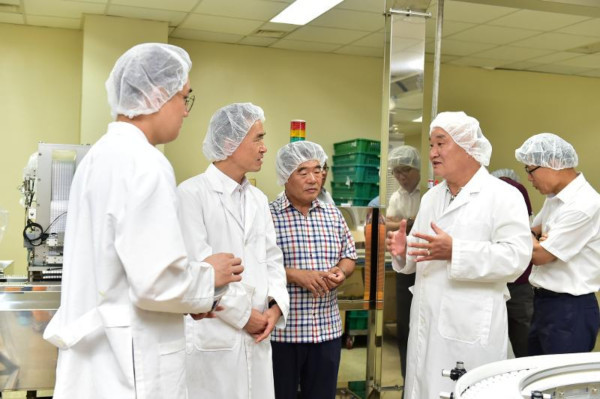 이항진 경기 여주시장이 29일 관계공무원들과 멱곡동 소재 세진식품(주)을 방문해 기업현황, 애로 및 건의사항을 청취하고 공장 생산시설을 둘러보며 관계자들을 격려했다. 사진은 이 시장(왼쪽 두 번째)이 관계자로부터 생산 시설 설명을 듣고 있는 모습. (사진제공=여주시청)