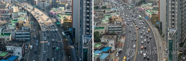 서울시가 구로고가차도 주변 디지털단지오거리 보도 확장 공사를 마무리하고, 오는 8월1일 0시 전면 개통한다고 30일 밝혔다. 사진은 확장 공사 전후 전경.