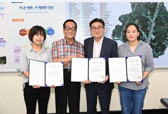 | ▲ 사진설명 - 왼쪽부터 명예시장 김효정 씨, 탁도균 씨 김일권 양산시장, 송혜원 씨 | ||