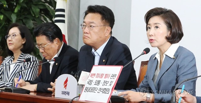 자유한국당 나경원 원내대표(오른쪽)가 31일 오전 국회에서 북한 미사일 발사관련 국방, 외통, 정보위-원내부대표단 연석회의를 열고 발언하고 있다.