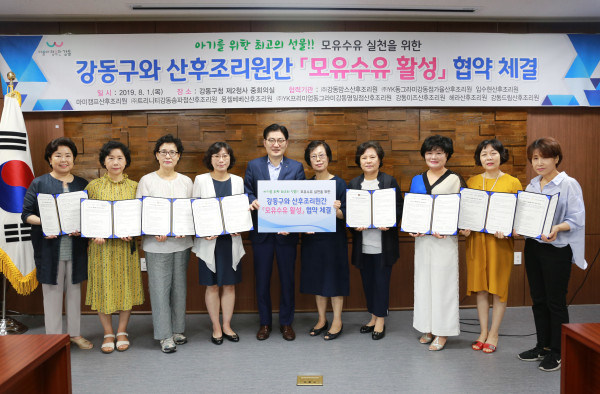 최근 서울 강동구가 지역내 산후조리원 10곳과 협약을 체결, 모유 수유를 활성화하기 위해 협력 관계를 구축하기로 했다. 사진은 이정훈 구청장(왼쪽에서 다섯 번째)이 협약 체결 후 기념촬영을 하고 있는 모습. (사진제공=강동구청)