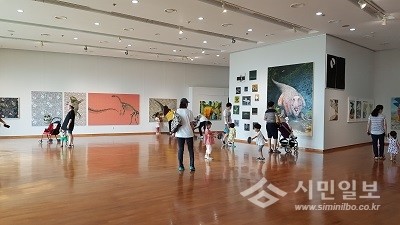 | ▲ 해남공룡박물관 내에 마련된 청년 작가전 작품들을 감상하고 있는 관광객들(사진) | ||