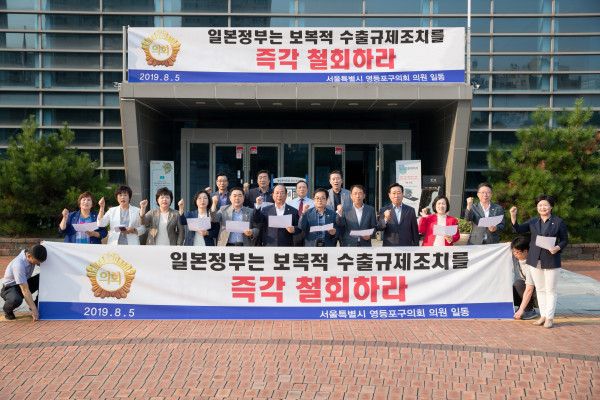 아울러 그는 “정치, 경제, 문화 1번지인 영등포구의회는 38만 구민들의 한마음 한뜻을 대변함으로써 일본 정부의 책임있는 행동을 촉구한다”며 “일본 정부는 국제사회의 무역질서를 어지럽히는 수출규제 조치를 즉각 철회하고 강제징용 피해 배상을 즉각 이행하며 영등포구민들은 일본 정부의 반성과 변화가 있을 때까지 일치단결해 적극적으로 대처할 것을 촉구한다”고 강조했다.