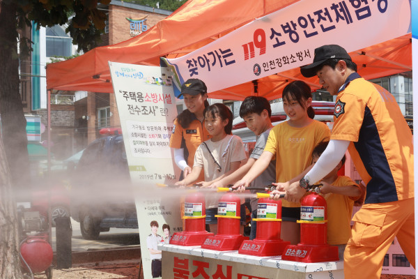 인천강화소방서는 8일 동막해수욕장에서 여름 휴가철을 맞은 피서객 및 지역주민 등 300여명을 대상으로 '찾아가는 119소방안전체험장'을 운영했다. 사진은 이날 119시민수상구조대원들과 함께 아이들이 소화기 사용법 실습을 하고 있는 모습. (사진제공=강화소방서)