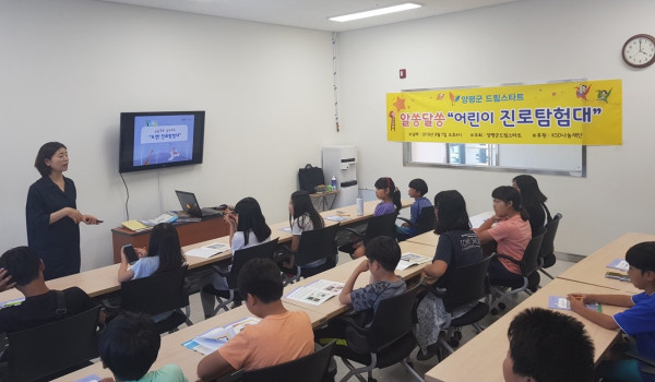 경기 양평군 드림스타트는 7일 행복플러스센터에서 드림스타트 아동 20여명을 대상으로 '진로탐험'을 주제로 진로교육을 실시했다. 이날 교육은 한국예탁결제원 나눔재단의 후원을 받아 다양한 직업 종류에 대해 알아봤다. 사진은 교육 진행 모습. (사진제공=양평군청)