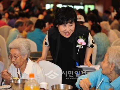 [시민일보]서울 송파구 풍납1동 소재 이스턴베니비스가 지난 31일 풍납 1, 2동 노인 300여명을 초청, '어르신 경로잔치'를 열고 음식을 대접했다. 이스턴베니비스 곽순란 대표가 초청 주민에게 덕담을 하고 있는 모습.