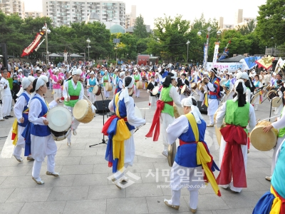 서울 노원구(구청장 김성환)가 9일 중계근린공원에서 구민과 함께 하는 ‘단오맞이 풍물놀이 한마당’을 개최했다. 본마당 행사에서 사물놀이패가 공연을 하고 있는 모습.