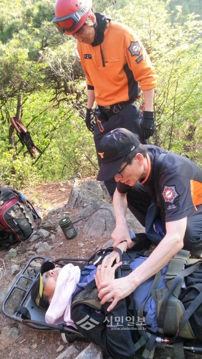하남소방서(서장 음두호)는 지난 9일 오후 7시경 남한산성 9부 능선에서 과도한 음주후 무리한 산행을 감행하다 실족하여 이마열상 및 찰과상을 입은 60대 등산객을 신속히 구조했다. 사진은 구조구급대원들이 등산객을 구조하는 모습.