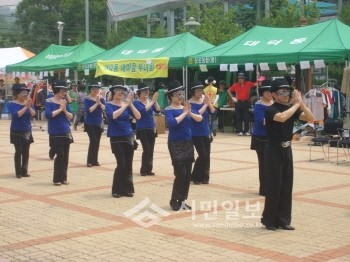 경기 고양시 화전·대덕동 및 직능단체는 최근 화전역 광장에서 “제1회 우리동네 나눔장터”를 연합 개최하였다. 사진은 주엽1동 실버라이댄스팀이 공연하는 모습.