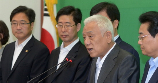 11일 오전 민주당 김한길 대표가 서울 여의도 국회 당 대표실에서 국정원 불법대선개입사건 관련 긴급기자회견을 하고 있다.