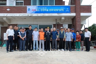 평택소방서(서장 이동우)는 11일 화재없는 안전마을로 선정된 '포승읍 내기4리' 선포식을 이장자택에서 열었다. 사진은 소방공무원, 마을주민, 의용소방대원 등 관계자들이 기념촬영하는 모습