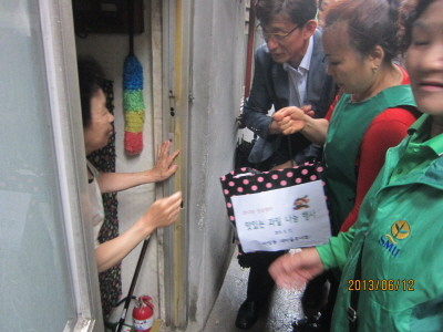 서울 성동구 마장동 새마을부녀회는 단오 하루전인 지난 12일 단오맞이 과일나눔 행사를 열고 지역내 이웃 30여가정에 과일을 전달했다. 부녀회원들이 주민에게 과일을 전달하고 있는 모습.