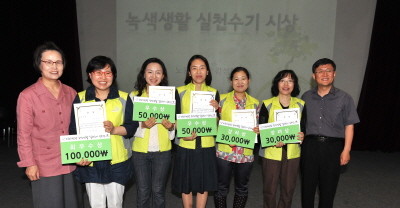 서울 노원구(구청장 김성환)가 ‘제4기 노원그린맘’ 환경교육 프로그램 수료식과 녹색생활 실천수기 시상식을 12일 오전 서울여자대학교 학생누리관에서 실시했다. 사진은 녹색생활 실천수기 공모전에서 수상한 어머니들이 기념촬영을 하고 있는 모습.