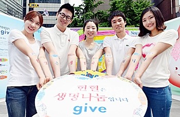 13일 오전 서울 종로구 청계광장에서 대한적십자와 한국쓰리엠 주관으로 마련된 '생명-나눔 기브 캠페인'에서 참가자들이 팔뚝에 작성한 헌혈과 나눔에 대한 응원메시지를 선보이고 있다.