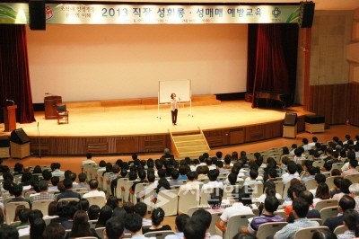 17일 경기 안양시에서 공무원을 대상으로 열린 직장내 성희롱·성매매 예방교육이 진행되었다. 사진은 정애숙(49세) 강사가 강연하는 모습.