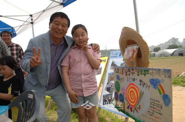 최근 경기도 남양주 월문리에서 ‘유기농 주말농장 축제’가 열렸다. 사진은 이석우 남양주시장과 참가자 어린이의 모습.