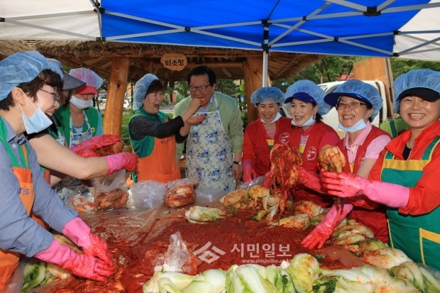 19일 서울 성동구청 앞 광장에서 '사랑의 김치 나눔' 행사가 열렸다. 성동·성수·옥수종합사회복지관, 성동노인종합복지관이 주관한 이 행사에 봉사자 100여명이 참가했으며 추후 3460가구에 김치를 전달할 예정이다.