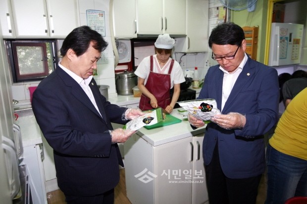 중구의회 소재권 의원(왼쪽)과 김영선 행정보건위원장(오른쪽)이 18일 위생점검을 위해 중림어린이집을 방문, 식재료를 살펴보고 있다. 중구 위생과는 급식 50인 미만의 소규모 어린이집을 대상으로 위생점검에 나서고 있다.