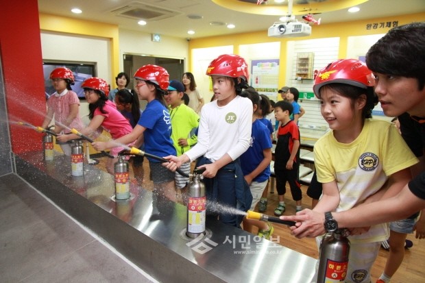 서울 구로소방서(서장 유건철)는 17일 오전 10시 신구로초등학교 3학년생을 본서 3층에 마련된 소방안전체험교실로 초청해 '지역 답사 프로그램'을 운영했다. 사진은 영상 시뮬레이션에 의한 가상화재진압 체험을 실시하는 어린이들 모습.
