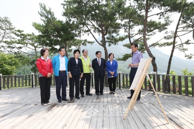 서울 종로구의회 건설복지위원회가 최근 제233회 정례회 기간중 인왕산공원, 와룡공원을 방문해 시설을 살피고 운영 현황에 관한 설명을 들었다. 왼쪽부터 이숙연 현택정 최경애 오금남 김복동(의장) 경점순 의원.