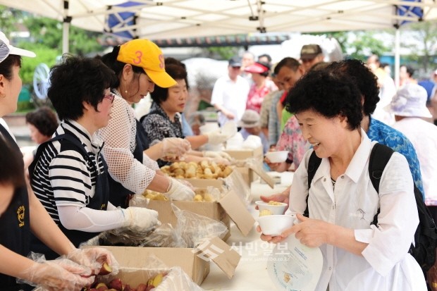 | ▲ 25일 서울 중랑구 소재 면목역 광장에서 6.25 전쟁음식 시식회가 한국자유총연맹중랑구지회 주관으로 열렸다. 자유총연맹은 이날 보리개떡, 주먹밥 등을 주민들에게 나눠줬다. 주민들이 신기한 듯 음식을 받아가는 모습. | ||