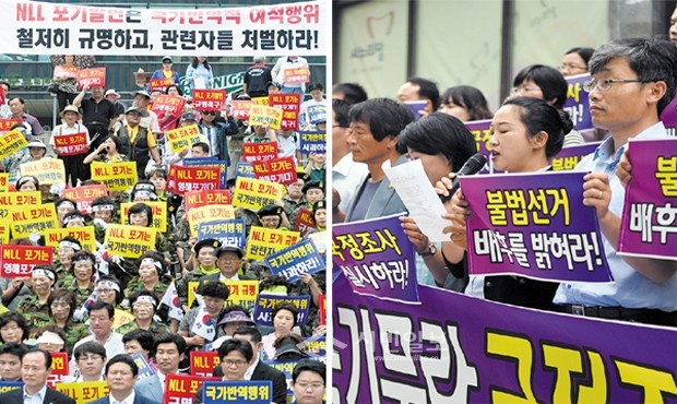 한국자유총연맹 회원들이 25일 오후 서울 중구 봉래동 서울역 광장에서 ‘노무현 전 대통령 NLL 포기발언 진상규명 촉구’ 기자회견을 하며 구호를 외치고 있다(좌). 또 오전 광주 북구 새누리당 광주시당 앞에서는 통합진보당 광주·전남·전북 지방의원단이 ‘국정원 불법 대선 개입 국정조사 촉구’기자회견을 열고 있다.