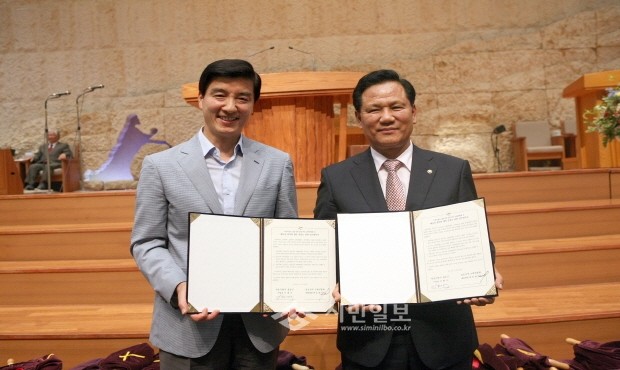[시민일보]서울 강동구와 강동지역교회연합회는 최근 '에너지 절약과 생산실천을 위한 업무협약'을 체결했다. 이에 따라 교회 300곳이 내년까지 에너지사용량 10% 절감을 목표로 절약운동에 동참한다. 이해식 구청장(왼쪽)과 한동철 목사(왼쪽)의 모습.