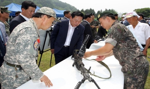 [시민일보]25일 경기 광주시 한 군부대에서 6.25 전쟁 63주년 기념행사 및 안보결의대회가 열려 군인 등 관계자 600여명이 참석, 호국영령을 기렸다. 조억동 광주시장이 군 관계자들의 설명을 들으며 총기를 살펴보고 있다.