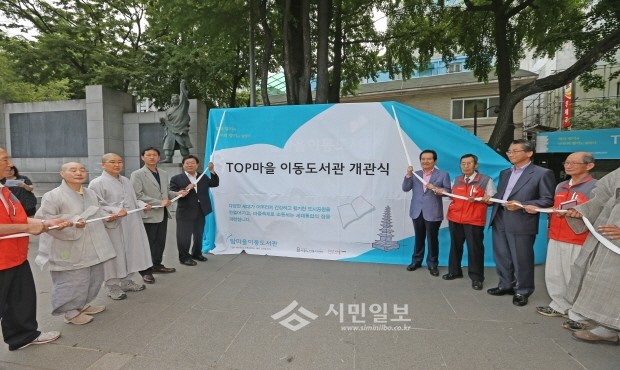 지난 26일 서울 탑골공원에서 탑(TOP)마을 이동도서관 개소식이 열렸다. 탑마을 이동도서관 운영 시간은 화~일요일 오전 10시~오후 4시까지다. 정세균 국회의원, 김영종 종로구청장, 김복동 종로구의장 등이 축하하고 있다.