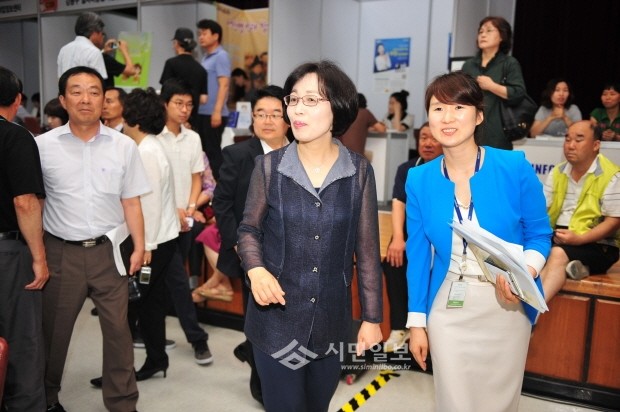 26일 '2013 찾아가는 희망취업 박람회' 가 열린 서울 송파구청 대강당이 구인구직 인파로 북새통을 이뤘다. 사진은 박춘희 송파구청장이 박람회장을 둘러보고 있는 모습.