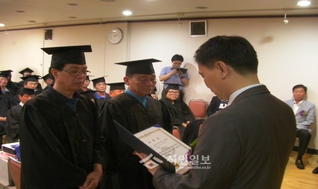 [시민일보]서울 마천중앙시장 상인대학 강좌를 수료한 전통시장 상인들이 졸업가운을 입은 채 수료장을 받고 있다. 송파구는 지난 4월 개설한 이 상인대학 강좌를 최근 마무리했다. 이 강좌에 상인 63명이 참가, 총 53명이 수료장을 받았다.