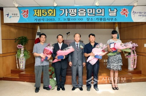 | ▲ 1일 가평군은 회의실에서 열린 7월 월례조회서 평소 남다른 봉사와 희생정신으로 자원봉사와 나눔, 그리고 지역사회발전에 앞장서 희망과 행복이 있는 미래창조도시건설에 기여해온 문향자, 이병호, 수도기계화보병사단 김회원씨 등이 도·군정시책 유공자로 선정돼 도지사·가평군수의 표창을 받았다. 사진은 가평읍장(가운데) 와 수상자들의 모습 | ||