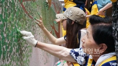 | ▲ '착한 디자이너 벽화봉사단'과 성동구자원봉사센터 등이 공동 주관한 '온동네 희망벽화 그리기'사업이 최근 서울 성동구 일대에서 완료됐다. 이 사업으로 마장2동 경로당, 응봉동 상봉경로당 담장 등에 벽화가 그려졌다. 봉사자들이 벽화를 그리고 있는 모습. | ||