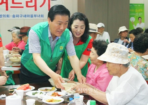 [시민일보]최근 서울 송파구청 구내식당에서 '효도삼계탕 끓여드리기 행사'가 새마을지도자협의회, 부녀회 주관으로 열려 200여명의 노인이 삼계탕을 대접받았다. 송파구의회 박용모 의장이 행사장을 방문, 주민들과 인사하고 있다.