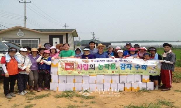[시민일보]지난 1일 고양시 탄현동 통장협의회(회장 오인수)는 통장과 공무원 등 45여명이 참석해 '구산동 사랑나눔 감자밭'에서 10Kg들이 150개의 박스를 수확해, 홀몸노인 등 어려운 이웃 70여 가정에 전달한다. 사진은 감자캐기에 참여한 통장 및 공무원들과 밭에서 캔 감자박스의 모습.
