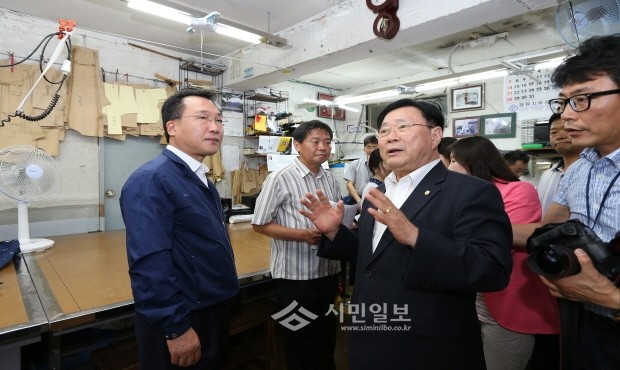 [시민일보]방하남 고용노동부장관과 서울 종로구의회 김복동 의장은 지난 2일 창신동 봉제사업장을 방문해 봉제업 종사자들의 애로사항을 청취했다. 김복동 의장(가운데)이 봉제산업의 지원을 당부하고 있는 모습.