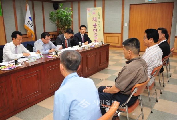 4일 서울 송파구청 대회의실에서 석촌호수변 관광호텔인 로사나부띠끄 호텔 구직 매칭데이 행사가 열렸다. 면접장을 방문한 구직자들이 면접관의 질문을 기다리고 있는 모습.