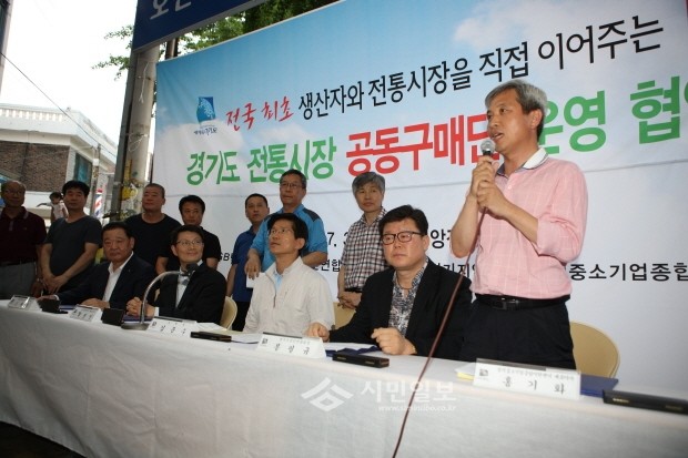 지난 3일 경기 오산 중앙시장에서 '경기도 전통시장 공동구매 운영협약식' 행사가 열렸다. 이 행사에 김문수 경기도지사, 봉필규 경기상인연합회장, 조재록 농협경기지역본부장, 최병인 (주)KGB택배 대표이사, 홍기화 경기중소기업종합지원센터 대표이사 등이 참석했다. 곽상욱 오산시장이 발언하고 있는 모습.