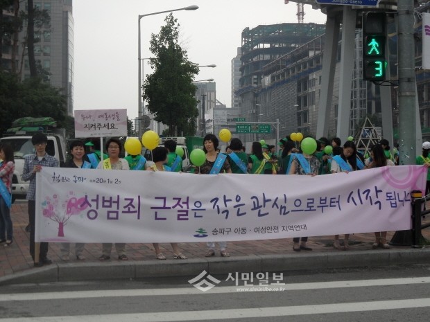 10일 송파구는 잠실역 앞에서 지역내 13개 단체 179명이 참여해 성폭력 예방 및 근절 캠페인을 실시했다. 사진은 잠실역 출구 앞에서 플랜카드를 들고 성폭력 예방 및 근절 캠페인을 하는 모습.