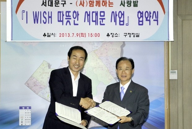 서대문구(구청장 문석진)가 9일 오후 (사)함께하는 사랑밭과 ‘I Wish 따뜻한 서대문 사업’ 협약을 맺고 서대문구에서 저소득 주민에 대한 물품 지원, 사랑의 밥상 전달, 노후 연탄보일러 수리, 저소득 가정 집수리 등의 사업을 펼친다. 사진은 협약식 모습.