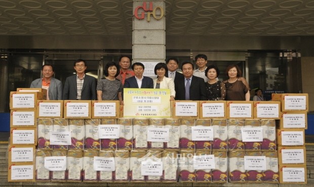 지난 11일 구로소방서 의용소방대(대장 강인덕, 김상임)는 지난 6월14일 구로구청 앞마당에서 개최한 ‘제1회 119 사랑 나눔, 행복 나눔의 장터’ 바자회 수익금 중 300만원 상당의 기부금품(성금 200만원, 물품 100만원)을 이성 구로구청장 및 의용소방대 간부들이 참석한 가운데 구로희망복지재단에 전달하는 행사를 가졌다.사진은 전달식 모습.
