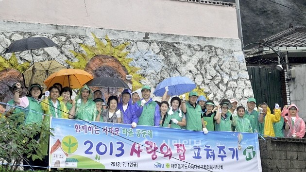 [시민일보]지난 12일 홍제3동 개미마을에서 ‘2013 사랑의 집 고쳐주기’ 행사가 열렸다. 사진은 봉사활동에 나선 새마을지도자와 서대문구협의회 회원들이 파이팅을 외치고 있다.