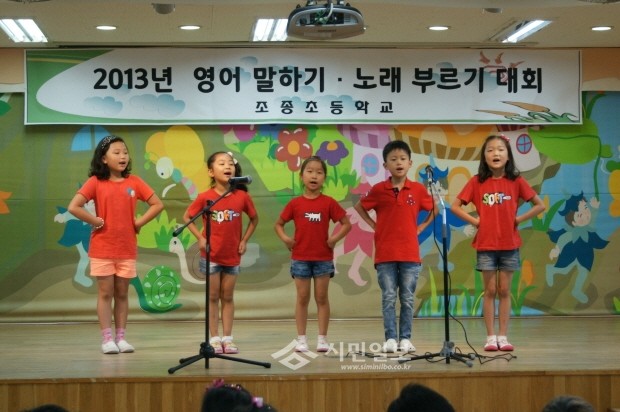 [시민일보]경기도 가평군 하면 조종초등학교는 지난 16일 전교생이 함께한 영어 노래 부르기 및 말하기 대회를 개최했다. 사진은 1~2학년생들이 영어로 노래부르는 모습.