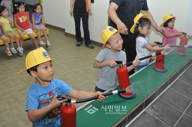 지난 16일 은평소방서 시민안전체험교실에서 큰나무 어린이집 원생 및 지도교사 등 28명을 대상으로 주택화재예방 소방안전교육을 실시하였다. 사진은 아이들이 소화기 시뮬레이션실에서, 평상시 불이 났을 경우 119신고 요령과 소화기를 이용하여 가상 화재 상황에서 신속하게 화재진압을 하는 소화기시뮬레이션을 체험하고 있는 모습.